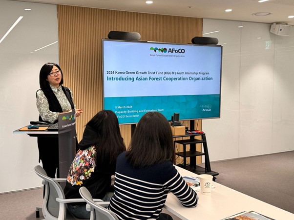 On March 5, 2024, KGGTF’s interns visited AFoCo in Yeouido. Ms. Suzin Ryang introduced AFoCO's work. AFoCO, established six years ago, fosters green alliances among nations. Since 2015, it's been a key international forestry body, achieving milestones like observer status at the UN Convention to Combat Desertification in 2020 and opening an education center in Myanmar in 2021.