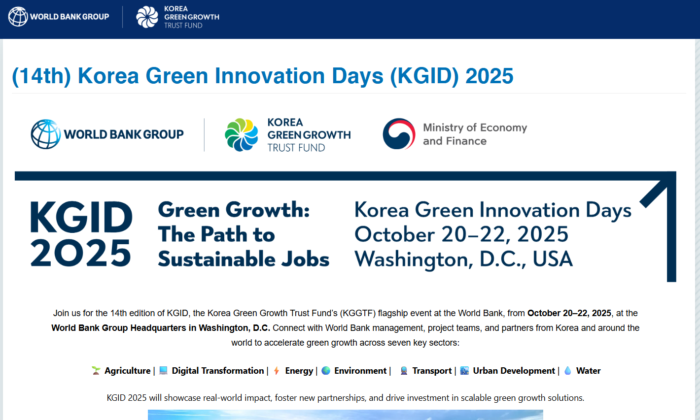 Korea Green Innovation Days (KGID) “Green Growth: The Path to Sustainable Jobs," was held at World Bank Group headquarters, on October 20-22, 2025 in Washington, DC. USA, jointly organized with the Ministry of Economy and Finance (MOEF) of the Republic of Korea, the donor of KGGTF.